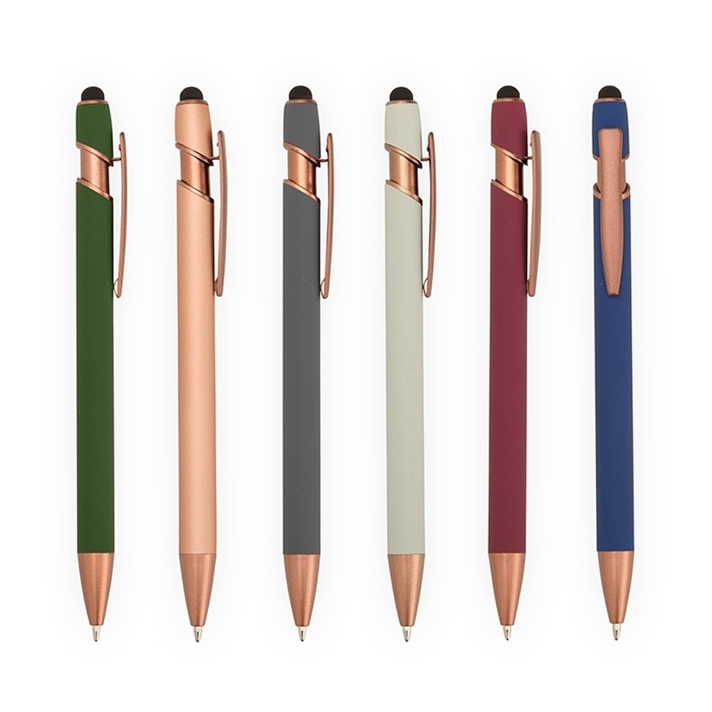 Caneta plástica triangular com ponteira emborrachada para interação em dispositivos de telas sensíveis ao toque. Possui clip com revestimento em feltro no topo, ideal para limpeza de tela, além de abertura que funciona como suporte para celular. Conta ainda com marcação de régua de 7 cm no corpo, acionamento por rotação e carga esferográfica azul de 1,0mm.